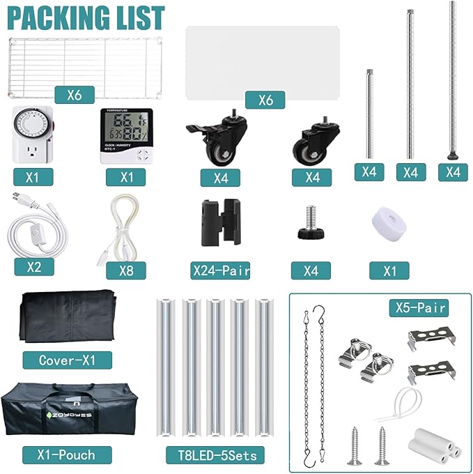 - 6. The growth bracket includes: ZOYOYES metal plant long bracket kit x1, T8 growth lamp kit x1, fully enclosed growth tent x1, hook and loop tape x1, mechanical timer x1, temperature and humidity meter x1, installation manual x1