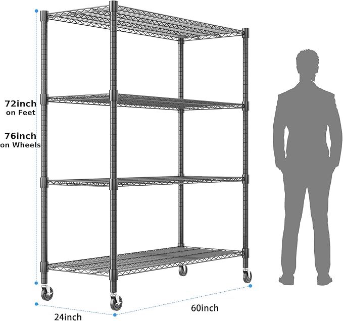 - 【LARGE STORAGE SPACE】Our 60" x 24" x 72"(on feet)/ 76" (on wheels) storage shelving unit, offers generous capacity for both home and industrial use. Whether in kitchens, bathrooms, living rooms, offices, warehouses, or commercial settings, it ensures a tidy and organized environment with ample storage space