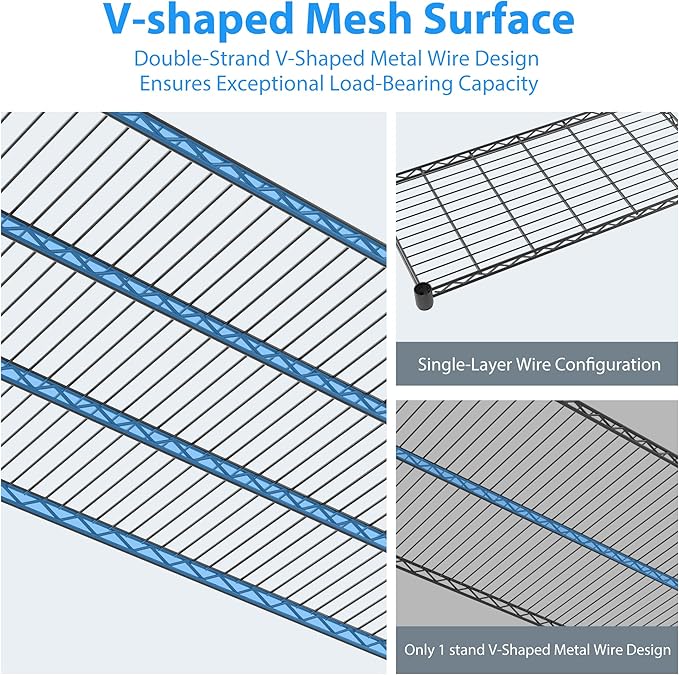 - 【COMMERCIAL GRADE LOAD CAPACITY】The heavy duty shelving unit holds up to 2500 lbs on leveling feet (800 lbs on wheels), featuring sturdy carbon steel construction with 1-inch pipes and reinforced dual-layer design. Its powder-coated finish ensures rust resistance, making it suitable for industrial-grade use