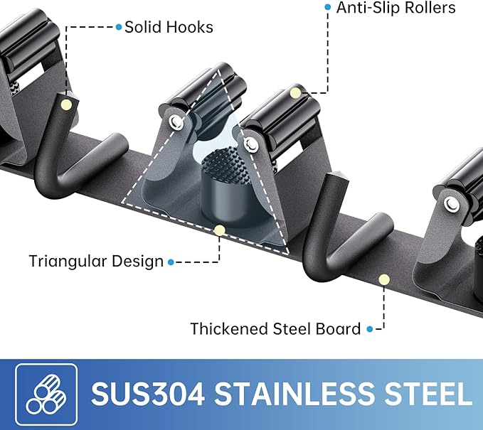 - 🏡【STURDY BROOM HOLDER】Each broom holder wall mount has 4 racks and 5 hooks. Our broom holder is made of sturdy 304 stainless steel which means it is corrosion-resistant, rustproof and waterproof. Compared with the plastic broom rack, our broom organizer is more stronger and has a longer service life.