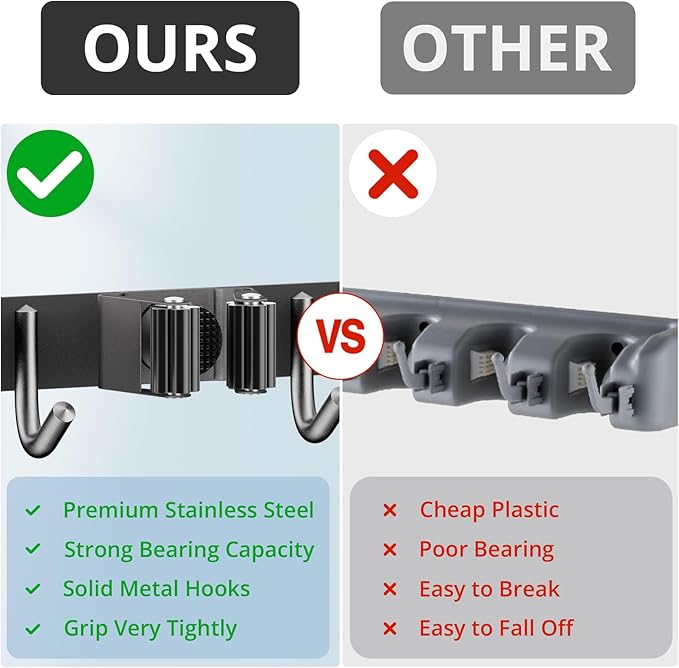 - 🏡【STURDY BROOM HOLDER】Each broom holder wall mount has 3 racks 4 hooks. Made of sturdy 304 stainless steel, the broom holder is corrosion-resistant, rustproof and waterproof. Compared with the plastic broom rack, it is more stronger and has a longer service life.