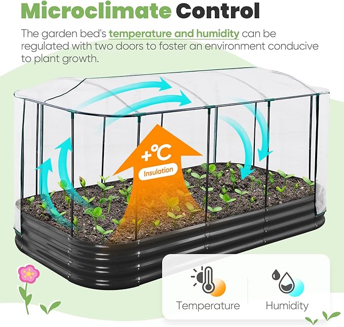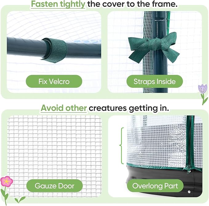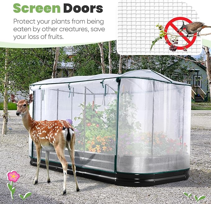 - 【Dual Zippered Screen Doors】The two doors not only make your daily plant care routine more convenient but also facilitate the flexible regulation of temperature and humidity inside. The screen ensures air circulation while also protecting plants from small animals. No more worrying about birds pecking at your broccoli and strawberries!