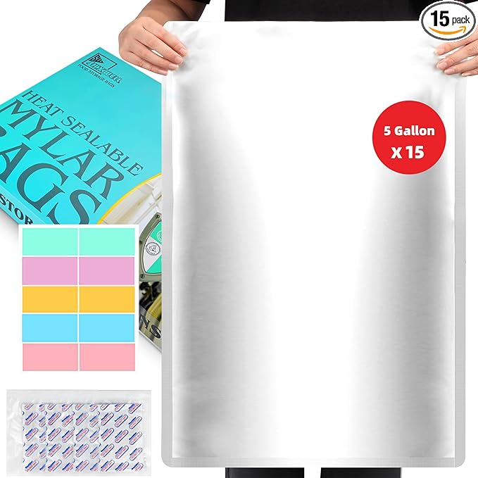 15PCS 5 Gallon Mylar Bags with 2500CC Oxygen Absorbers & Labels, 10.5 Mil Thick 17"x 27" Vacuum Sealer Bags Heat Sealable Bag for Long Term Food Storage