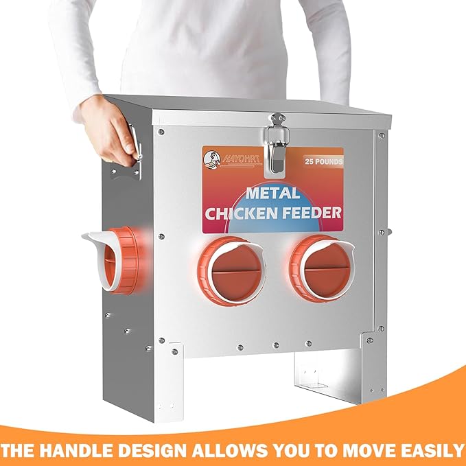 - 🐓LARGE CAPACITY: Automatic poultry feeder can hold 25 pounds of feed, chicken feeder is enough for 4 adult chickens to eat at the same time for about 20 days. Save your feeding time. No burden when traveling far away