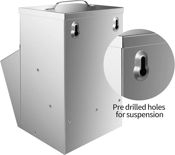 - [Hangable design] The handle on the lid is smooth and not easy to harm the hands. The back of the poultry feeder has pre drilled holes for hanging, and you can choose to hang it on a wall or fence for use.