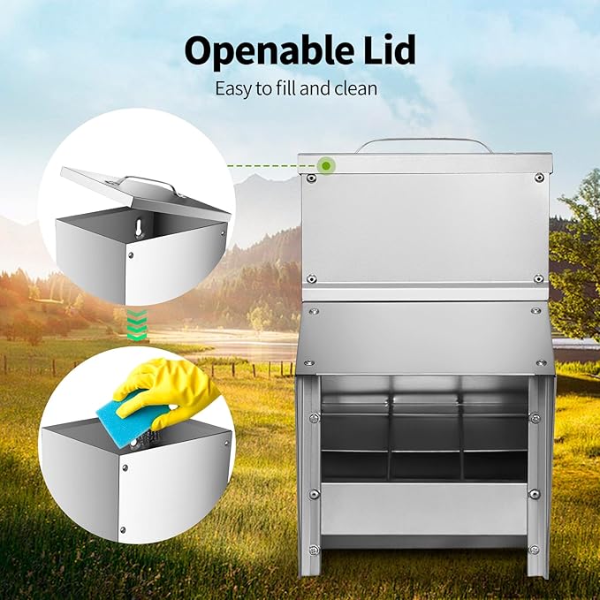 - [Easy to clean] Open the lid on the top of the poultry feeder and use tools such as a cleaning cloth to clean the inside.