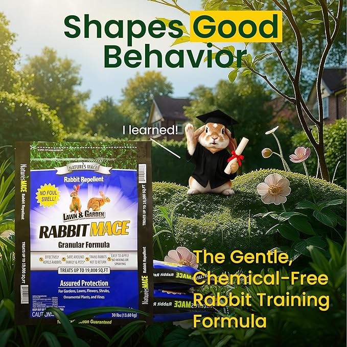 - How-To-Use: For the first application, apply Rabbit MACE granular heavily and evenly 18” away from flowerbeds, ornamentals, gardens, ground cover, and crops in danger of rabbit browsing. Apply a 24” (2 foot) wide barrier around plant groups. You can also sprinkle between plant groups. With regular application, on a 7 to 10-day rotation, you’ll save shrubs, flowers, trees, and vegetables by teaching rabbits to stay clear of landscaped and garden areas.