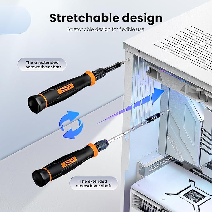 - 【Unique Handle Design and CRV Material】 The screwdriver handle is made of TPR and PP materials, the cap is rotatable, and it adopts an extended tool bar design. The length of the tool bar can be adjusted, making it easy to reach deep for disassembly. Screwdriver bits are made of high-quality CRV steel, which is wear-resistant and has high hardness.