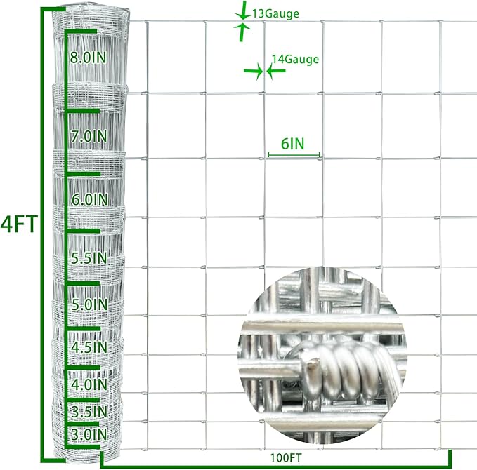 Farm Fence 4ft x100ft, 13GA Thickened Heavy Zinc Coating Cattle Fence, Galvanized Field Wire Fencing, for Garden, Goat, Hog, Yard Livestock, Farm, Animals and Field Protection Use