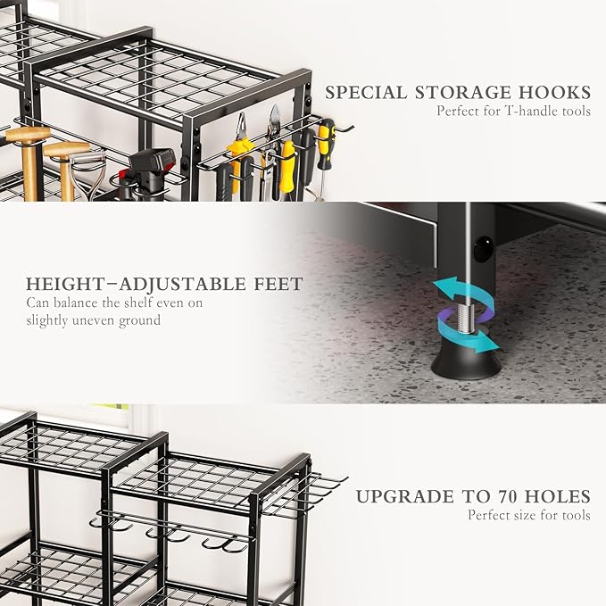 - 【Durable Metal Construction】 This garage tool storage is made of high-quality carbon steel material with excellent durability and stability. The sturdy metal construction ensures long-term reliability and is not easily deformed or damaged. and the adjustable height feet allow you always to find a balance point on various floors, always stable without shaking or collapsing.