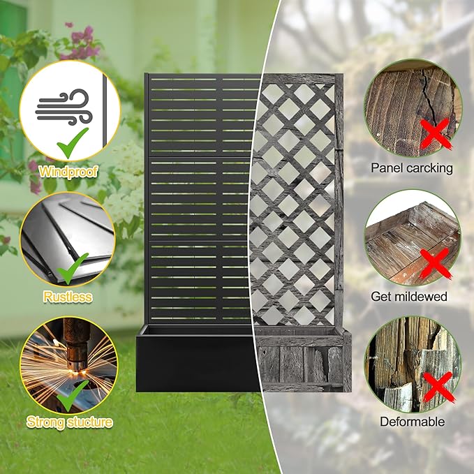 - Versatile Design: This metal planter with a trellis serves multiple purposes, making it the ideal choice for your garden. Use it as a beautiful flower stand or as an outdoor privacy screen.