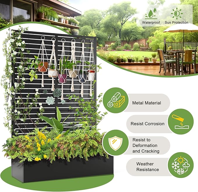 - Versatile Design: This metal planter with a trellis serves multiple purposes, making it the ideal choice for your garden. Use it as a beautiful flower stand or as an outdoor privacy screen.