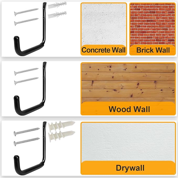 - WIDE VARIETY OF USES - 10" Heavy-duty large wall hooks are ideal for hanging a ladder, bike, chair, shovel, stroller, hose, and other objects found in garages, gardens, and homes. Not only do they help you save space in your home, but they also offer a wide variety of uses.