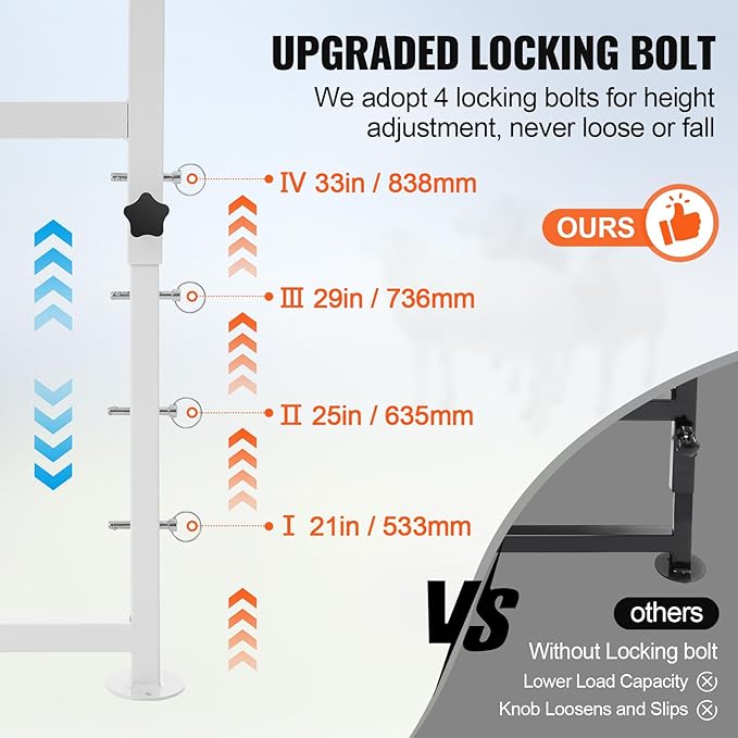 - 3. **✔ 🌻 Adjustable Lamb Stand for Hoof Trimming**: Our lamb stand offers flexibility with a unique pin and knob design for height adjustments (21", 25", 29", 33"). It ensures stability with a reliable pin-lock system and reinforced tabletop welding.