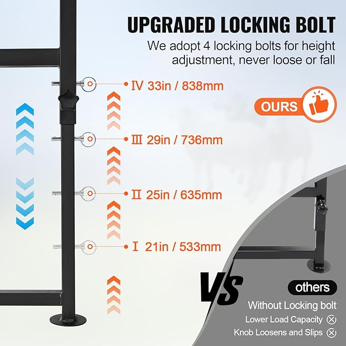 - 4-Level Adjustable Height: Featuring a unique pin design, our goat stand offers four height settings ranging from 21" to 33", accommodating animals of varying sizes. Reinforced uprights with a triangular frame provide added stability and support, enhancing safety.