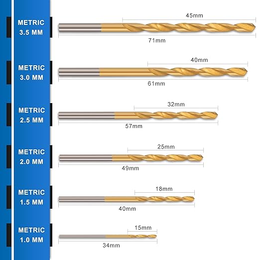 - 【120 PCS COMBO SET】 120 pcs jobber length titanium drill bits in 6 sizes from 1mm to 3.5mm ( 20x1.0mm, 20x1.5mm, 20x2.0mm, 20x2.5mm, 20x3.0mm, 20x3.5mm ) to have your different needs covered and increase overall productivity.
