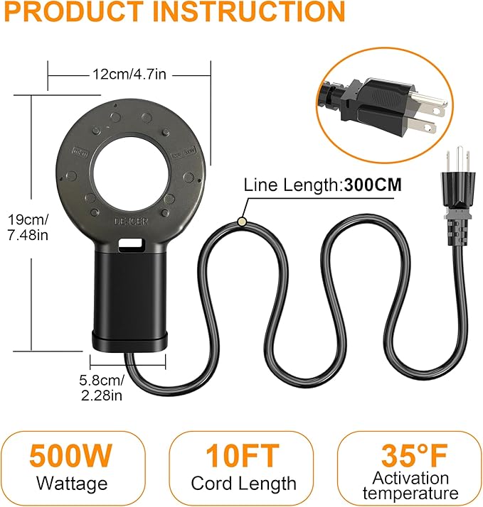 - Easy to Use-Please just need to place your De-icer in the center of the stock tank, bird bath, pond, etc,and plug in. And the heater will start work. It has a 10ft long cord with thicker wire diameters, which can use safty in winter,more longer than others. Note: Do not plug in without being in the water, as this will cause damage to the unit.