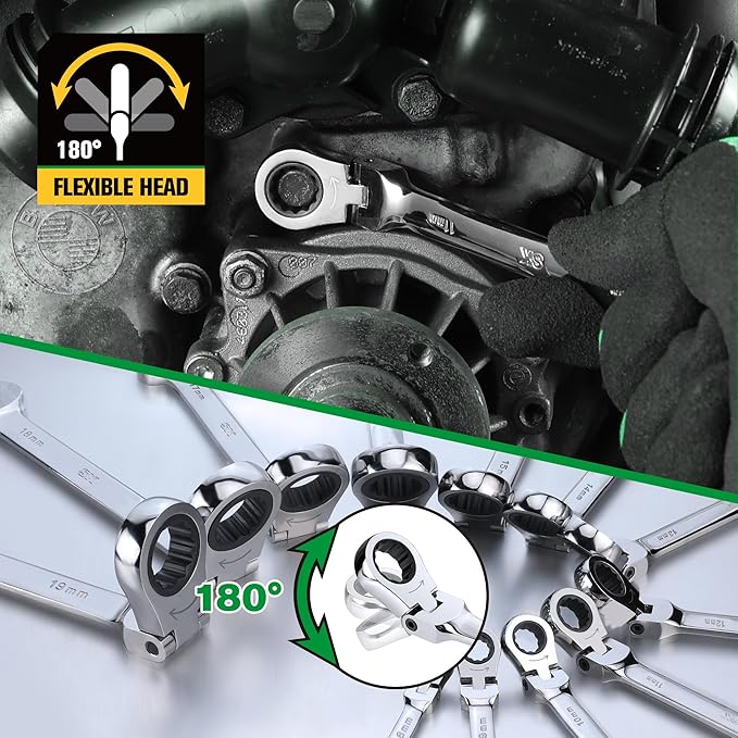 - The 180° flex/pivoting head easily navigates obstructions in narrow spaces. The 72-tooth ratchet gear requires just a 5-degree swing arc, while the 12-point full-drive box end provides a firm grip and improved torque. Directional markings help you quickly tighten or loosen bolts and nuts
