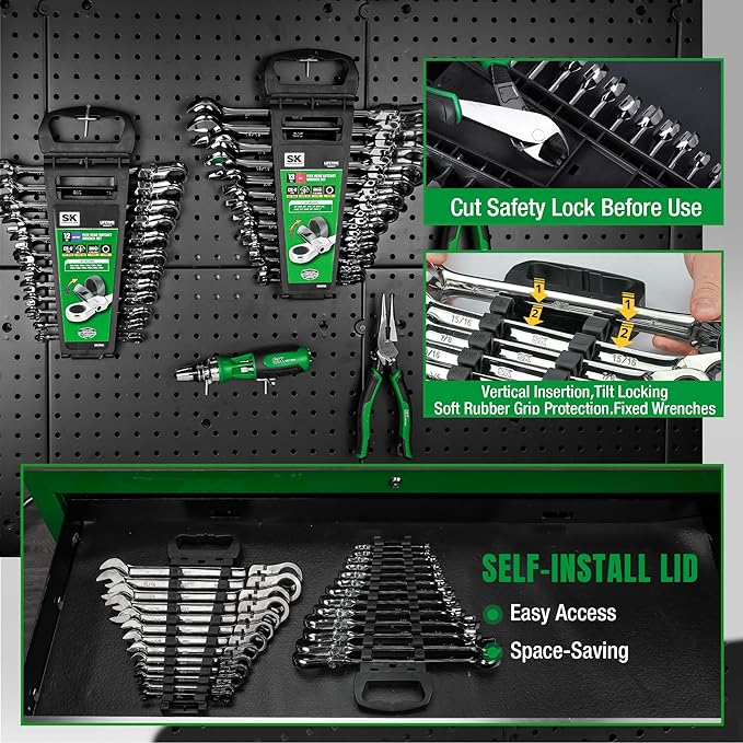 SK Flex-Head Ratcheting Wrench Set, Combination Wrench Set, 25-Piece, SAE 1/4" to 1", Metric 8 to 19mm, 72-Tooth, Premium CR-V Construction, with Rack Organizer