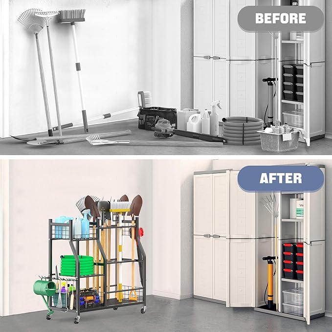 - Portable Design with Wheels: Easily move garden tools around your yard or garage with this wheeled organizer. Ideal for solid floors, the wheels offer flexibility that wall-mounted racks lack, allowing you to roll the cart close to your work area or outside