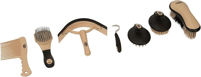 - 7-Piece Grooming Kit: Weaver Equine’s grooming kit for horses meets all your equine grooming needs; the horse care kit includes a comb, hoof pick, palm-held curry comb, face brush, mane and tail brush, dandy brush, and sweat scraper/coarse curry combo
