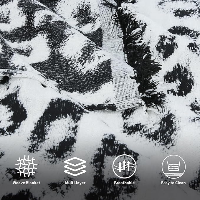 - 【Unique and Colorful Design】 -- Woven blanket with black and white of colors to form exquisite patterns of snow leopard pattern. Each detail comes together, evoking a sense of whimsy and free-spirited charm typical of the Bohemian aesthetic. The vintage throw blanket with fringe design adds a playful and stylish touch. The cascading tassels create a sense of movement and texture, enhancing the overall personality of the blanket. Making it a unique and eye-catching addition to any space.