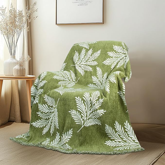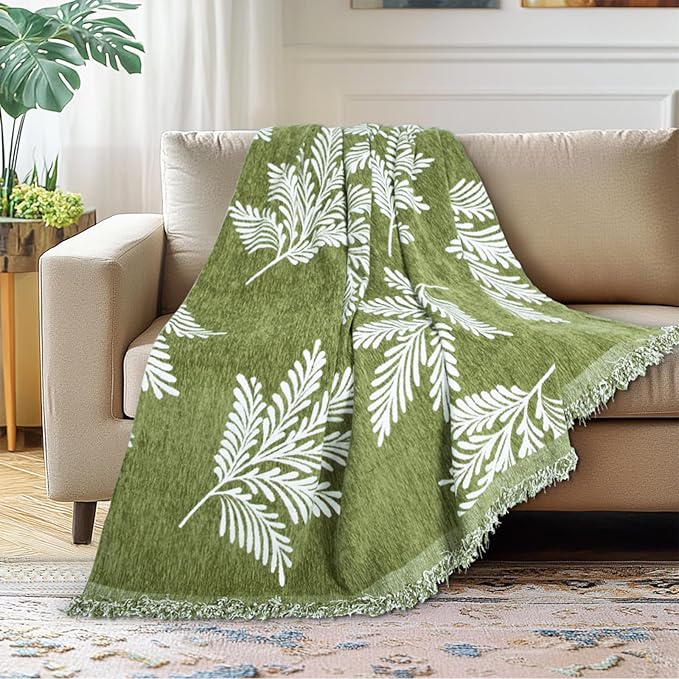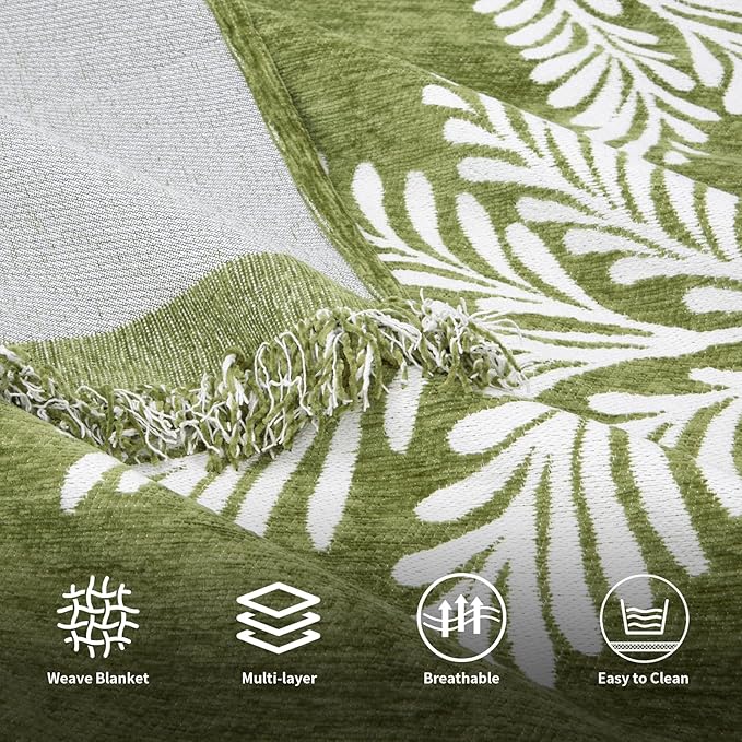 MACEVIA Boho Throw Blanket for Bed, Green Leaf Printed Blanket, Leaf Woven Boho Blankets and Throws with Tassel for Couch Sofa, All Season Cottagecore Decor Boho Blanket (Green Leaf 50"×70")