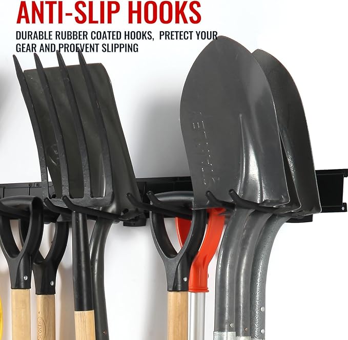 - ADJUSTABLE VERSATILE STORAGE: With a clamping screw, the hooks adjust along the wall track, accommodating various tool sizes. This garage storage system is ideal for organizing shovels, rakes, brooms, and more, making it a perfect yard tool organizer for garage.