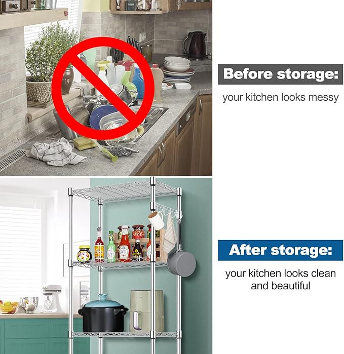 - 【Adjustable Height Design】Each layer of this metal shelf can be adjusted,you can adjust the height of the storage shelf according to the size of the item
