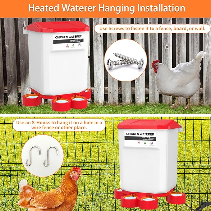 - 【Year-Round Ready & Freeze Protection】Our heated poultry drinker keeps water from freezing during the cold winter and stays warmer. In summer, you can use the waterer directly without plugging, which can provide warm and clean drinking water for your chickens year-round.