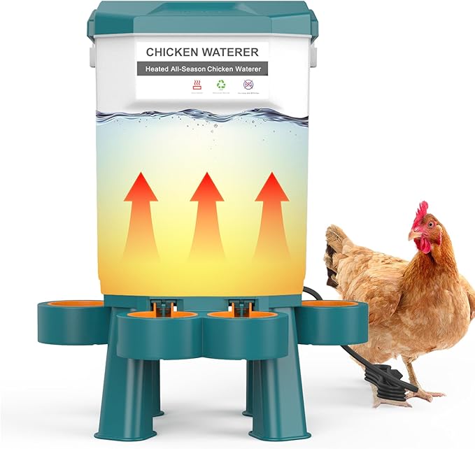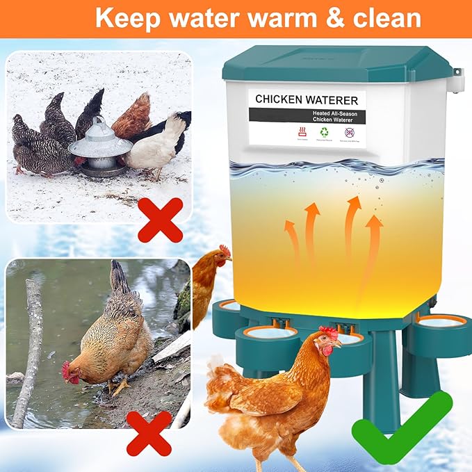 - 【Year-Round Ready & Freeze Protection】Our heated poultry drinker keeps water from freezing during the cold winter and stays warmer. In summer, you can use the waterer directly without plugging, which can provide warm and clean drinking water for your chickens year-round.