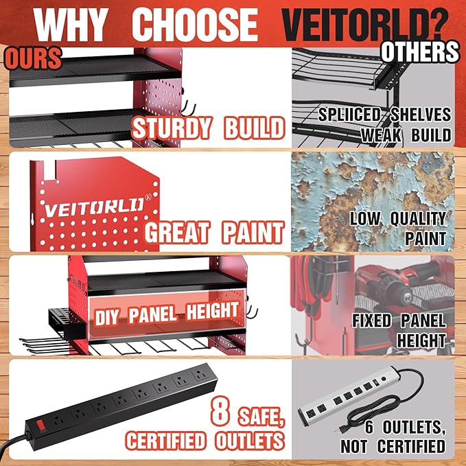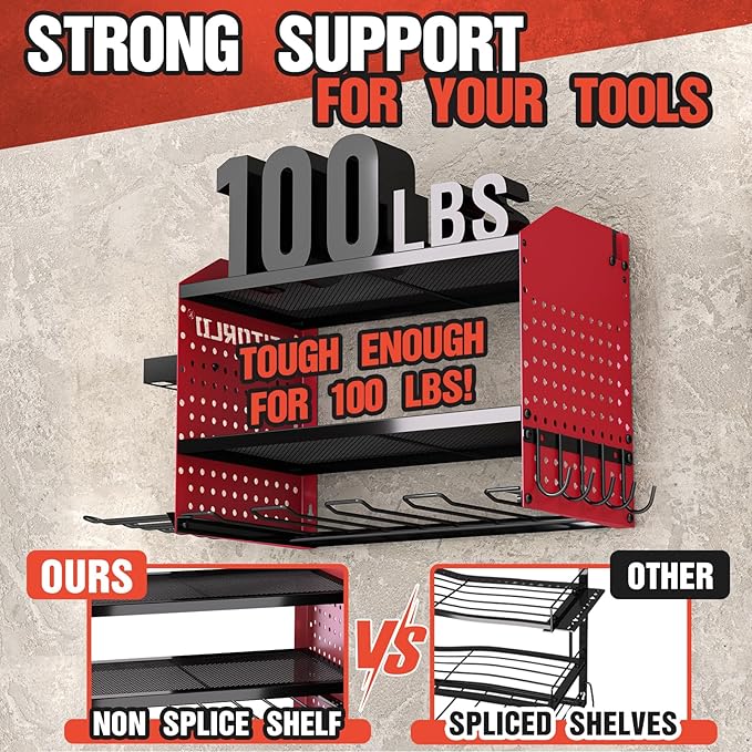 - Efficient Charging Station: Keep your tools ready to go with our integrated power tool organizer wall mount, featuring 8 AC outlets with overload protection. Charge multiple devices simultaneously, boosting your work efficiency