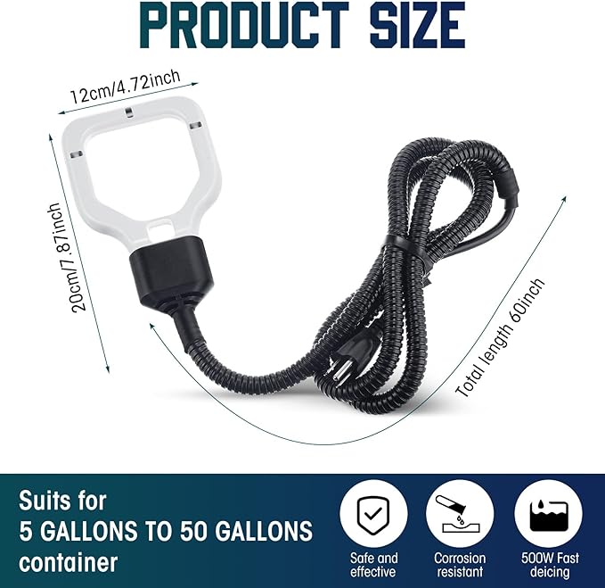 - Versatile Animal Water Heater: ensure a constant supply of fresh drinking water for both livestock and wildlife using this 500-Watt submersible bird bath heater; Ideal for a range of applications on the farm, garden or at home; Water tank heater suits containers ranging from 5 to 50 gallons; Common uses include water buckets, small animal waterers, and birdbaths