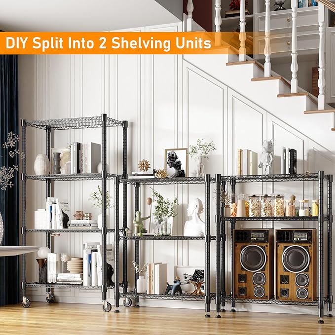 - 【ADJUSTABLE HEIGHT】Each layer of the wire shelf can be adjusted to match the height of your items, optimizing your storage space. Additionally, you can join two storage racks to form a wider unit, providing extra width to meet your needs. No matter your requirements, you can assemble a shelf configuration that fits just right