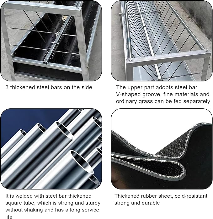 - Features: The widened and deepened sheep trough adopts a U-shaped design, which does not hurt the mouth of livestock, and the semi-circular bottom design surface is smooth and has no dead corners, which increases the overall capacity, reduces the number of times to fill hay, improves feeding efficiency, saves time and effort, and is easy to clean. Provide a convenient grazing place for your goats, sheep, horses and other livestock all day long.