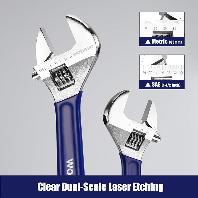 WORKPRO Adjustable Wrench Set, 6-inch, 8-inch, 10-inch, 12-inch Wide Jaw Wrenches with SAE and Metric Scales, Rubber Grip, Heat-Treated Steel for Home Repairs, Plumbing, and Garage Work