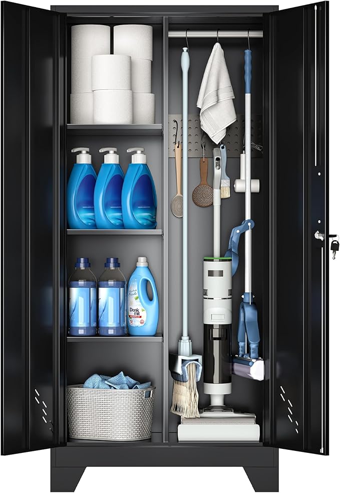 - 【Long-lasting & Sturdy Construction】: Dimensions: 61"H*27.6"W*13.8"D. Crafted from high-quality steel with a powder-coated finish, this utility closet is designed to resist corrosion and rust, ensuring long-lasting durability compared to wooden or plastic cabinets
