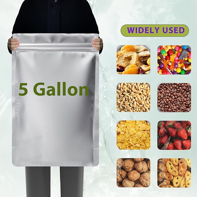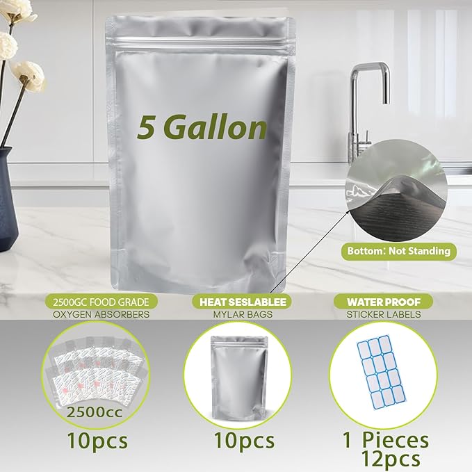 - Quantity: Pack of 10 mylar bags, 5 gallon capacity. 17x27 Inch bag includes 10pcs 2500cc oxygen absorbers and 10pcs stickers for long- term food container sets