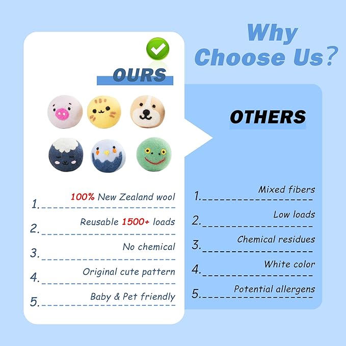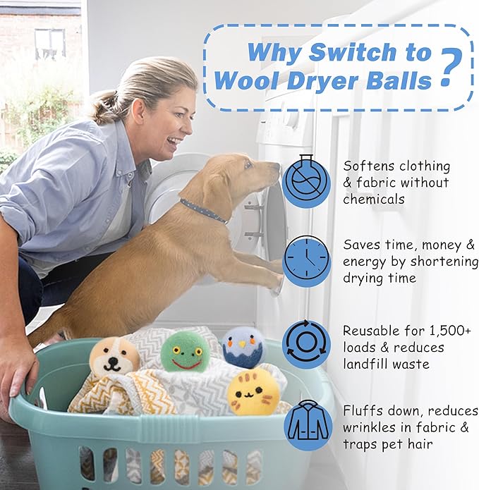 - 𝐒𝐎𝐅𝐓𝐄𝐍 𝐂𝐋𝐎𝐓𝐇𝐈𝐍𝐆 & 𝐑𝐄𝐃𝐔𝐂𝐄 𝐒𝐓𝐀𝐓𝐈𝐂 - Wool has natural anti-static properties, instead of liquid softeners containing chemicals, wool balls for dryer can make your clothes softer and fluffier, reduce wrinkles and static electricity attraction. At the same time, these cute laundry balls for dryer effectively prevent pet hair from getting into your clothes, so you can enjoy clean, static-free clothes, which is actually suitable for families with pets.