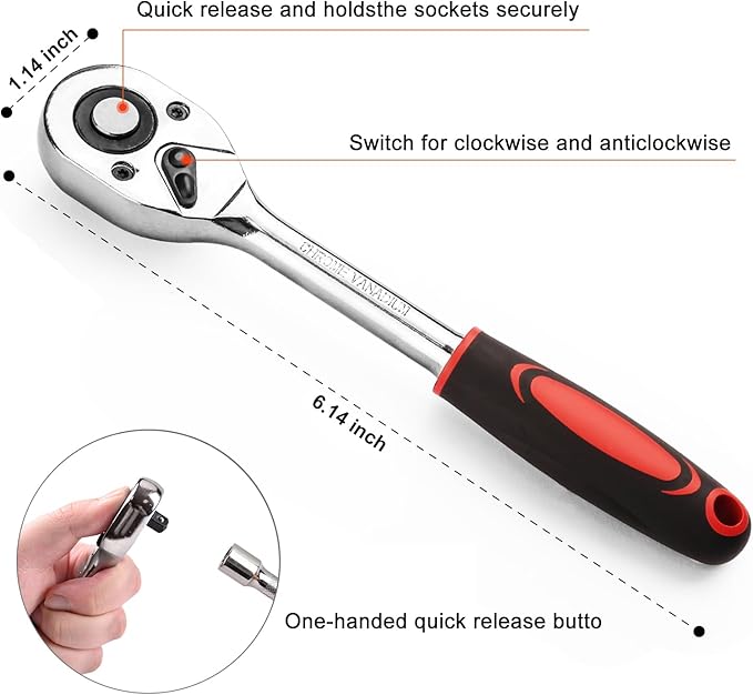 - Easily used and storage: 1/4 socket set comes with quick release switch and reversible mechanism for easy operation.The rubber handle for better and more comfortable grip. Its sturdy blow molded toolbox makes the sockets easy to store and carry.
