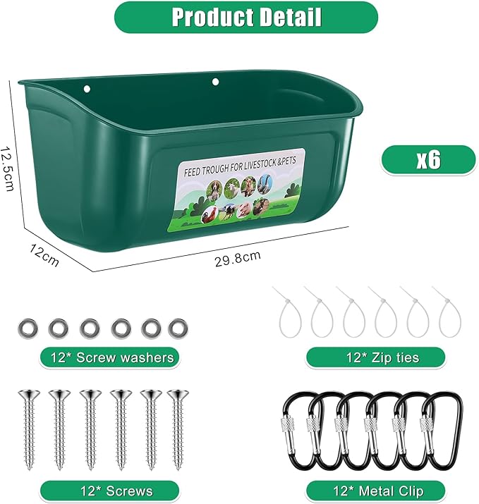 - Easy Mounting, Easy Adjustment: Each feed trough comes with 2 heavy-duty metal clips, screws & nylon zip ties for hanging, or as a portable feeder that's quick to install or move. Easy to use as they are made of lightweight material and extremely durable, can be suspended from wire mesh, as well as mounted on fences or walls. And our nylon zip use one-way locking clips ensures that the buckle locks more securely and is less likely to be knocked out by animals