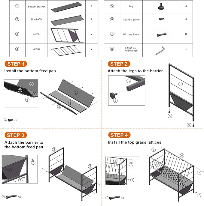 - Easy to Install & Maintain: The installation of hay feeder do not require tedious steps. You only need to put the bottom pan, the top rack and side barrier together. And we provide all the necessary accessories for installation. So you don’t need to buy them again in the markets, which saves lots of time for you. At the same time, the feeder is also very easy to maintain, if there is dust and dirt on their surface, just needs a simple wipe to clean it up.