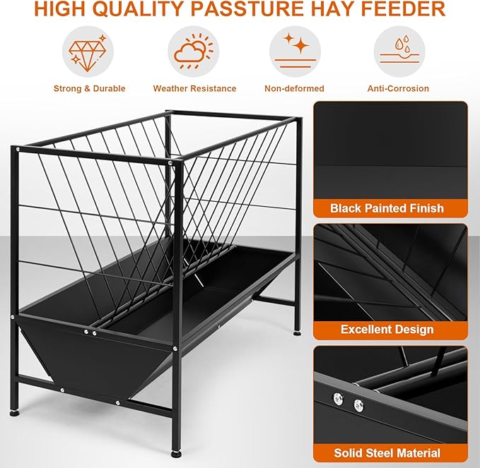 - High Quality Pasture Feeder: HomiShare pasture hay feeder made of heavy duty premium steel, which is stable and sturdy enough to withstand impacting and bending. At the same time, its surface takes black powder coated processing, not only makes it have good attribute to resistant corrosion and rust, but also look beautiful and textured. This frosted treatment greatly increases its service life.
