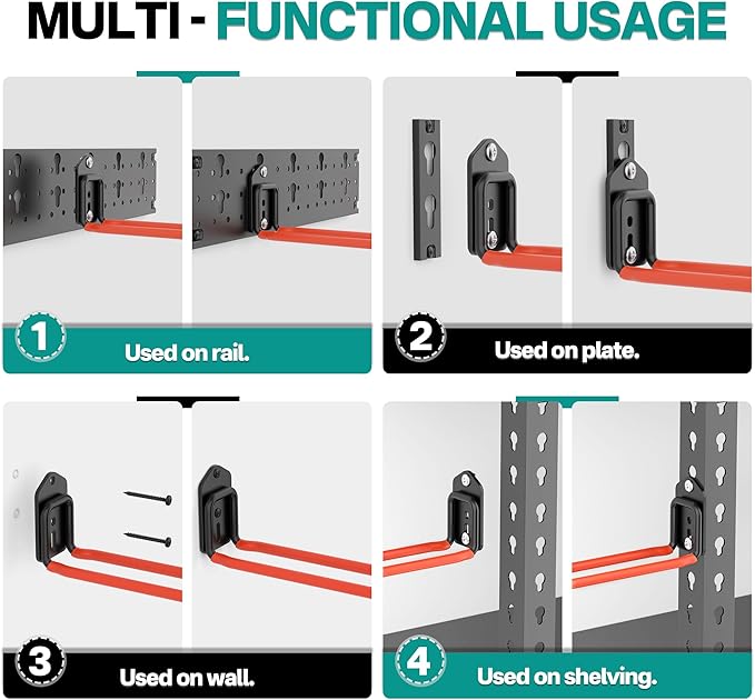 - Neat and Organized: The adjustable hooks are simple to remove and reposition to fit your changing storage needs. They snap onto the rails quickly, making it easy to store tools of all sizes on the wall and free up valuable floor space