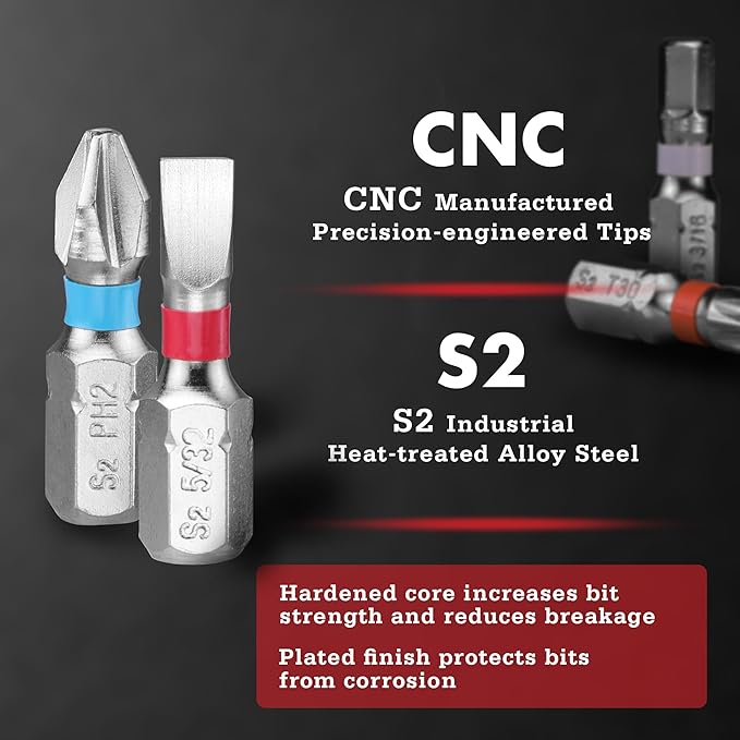 - Color-Coded S2 Steel Bits: Each bit is made of industrial-grade S2 alloy steel and color-coded for fast identification — Red (Slotted), Blue (Phillips), Orange (Torx), White (Hex), Green (Square). CNC-machined and heat-treated for high hardness, with anti-rust plating for long-lasting performance.