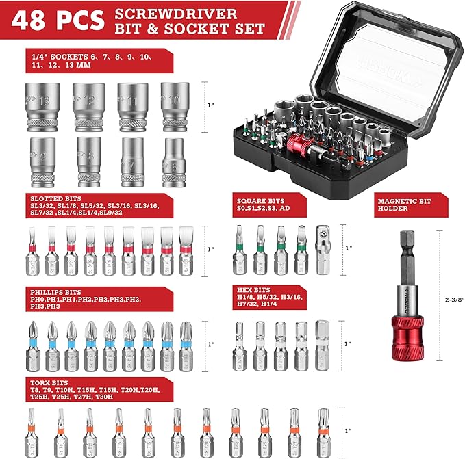 - Comprehensive 48-Piece Set: Includes 38 precision bits — Slotted (SL3/32–SL9/32), Phillips (PH0–PH3), Torx (T8–T30H), Hex (H1/8–H1/4), and Square (S0–S3) — plus 1 magnetic bit holder and 8 CR-V sockets (6–13mm). Works perfectly with power drills, electric screwdrivers, and mini ratchet wrenches for home, auto, and workshop repairs.