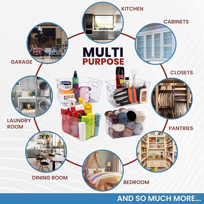 - YOU WON'T FIND A MORE VERSATILE SET OF BINS: You can use these large clear plastic storage containers with lids for organizing any space in and around your home – the kitchen, cabinets, closets, pantries, bedroom, dining room, laundry room, nursery, garage, kids toy room, under sink organizers and more.