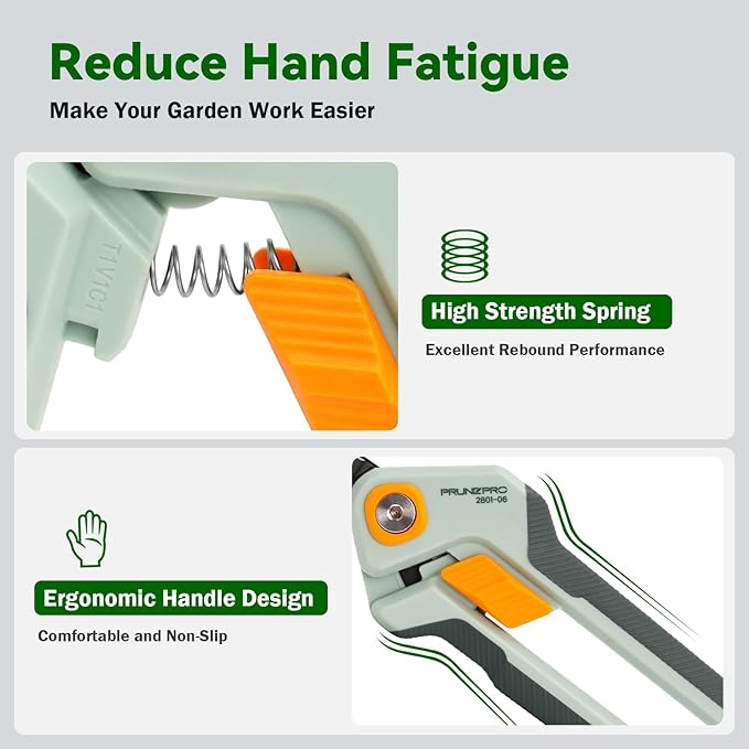 - 【Effortless Cuts Every Time】Equipped with a high-tension spring for reduced effort and ergonomic handles, these garden clippers offer a comfortable grip and reduce hand fatigue during extended use. This makes them ideal for a wide range of gardening tasks