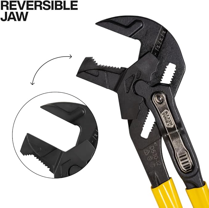 Klein Tools D53012 Plier Wrench, High Leverage Multi-Use Pump Plier with Adjustable and Reversible Double-Sided Jaw, Smooth and Knurled Teeth, 12-Inch