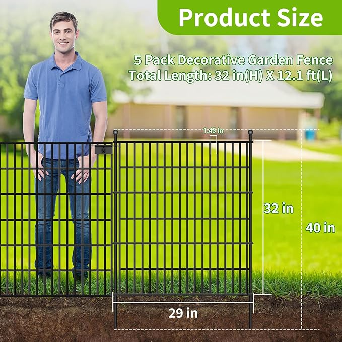 - 【Classic Exterior Design】Each garden fence animal barrier for backyard is 29 inches wide by 32 inches high and comes with 6 metal stakes that can be inserted 8 inches into the ground for sufficient stability. There are a total of 4 fence panels + 1 fence gate with a total length of 12.1 feet to perfectly suit your needs.